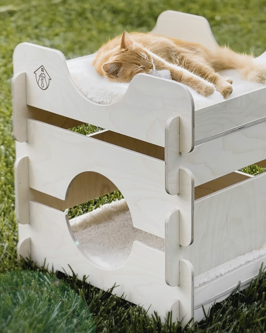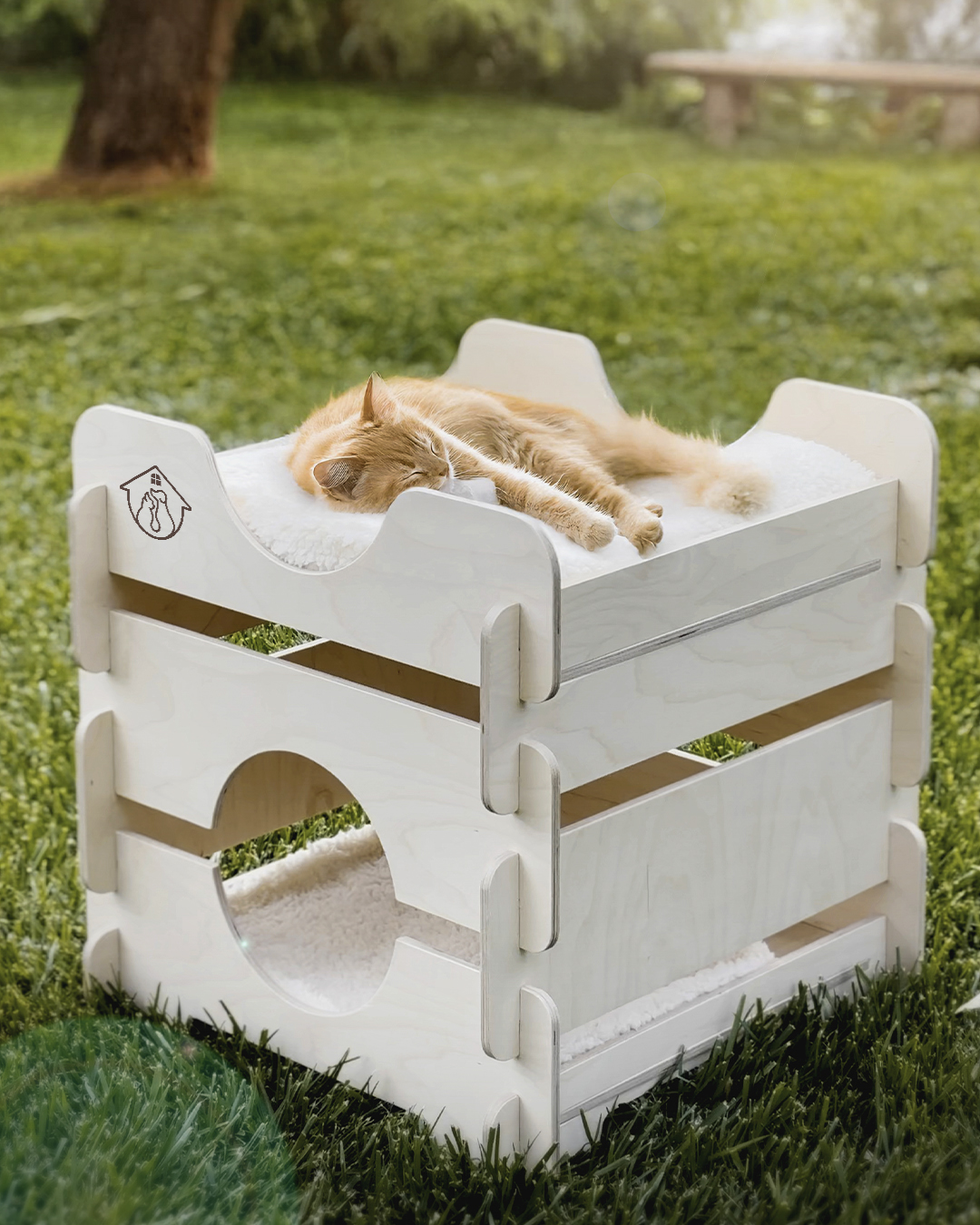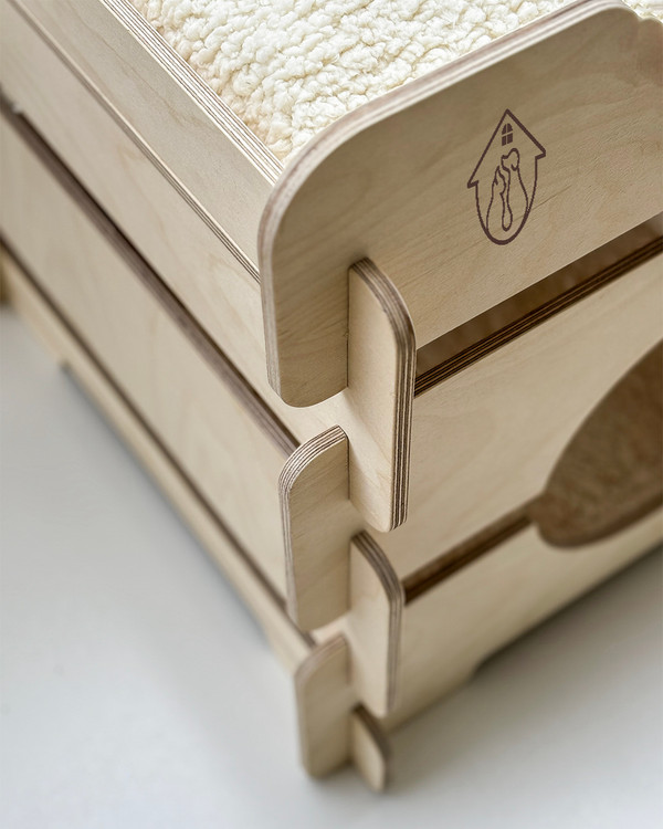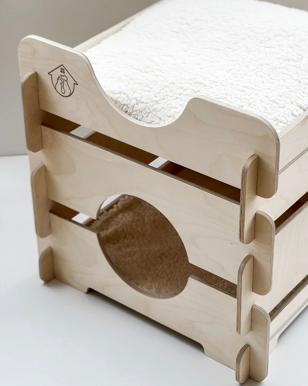 مکعب کاملا به صورت یک پازل توسط خودتون سرهم میشه و یک خونه دو طبقه برای گربه با دست خودتون داخل خونه درست میکنید.
